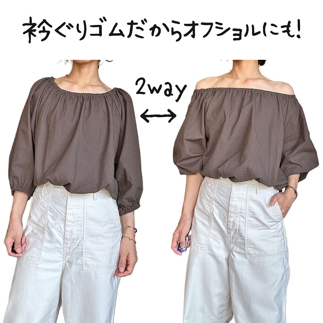 ゴム仕様なので、肩まで下げればオフショルブラウスとしても着用できる2way仕様。